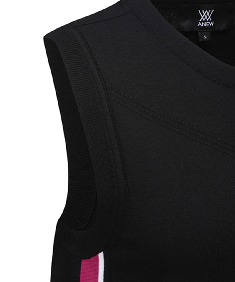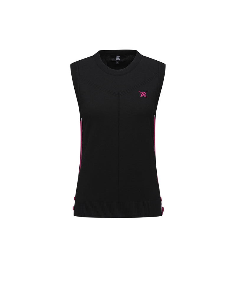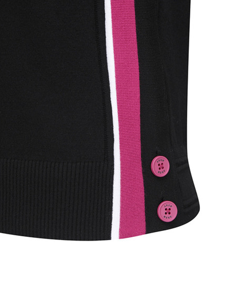 This is a light and warm women's round neck essential knit vest made with rayon yarn. It has multiple color point color combinations, making it easy to coordinate with various inner items. It is an item that can be comfortably adjusted and worn with trims and buttons at the bottom.
