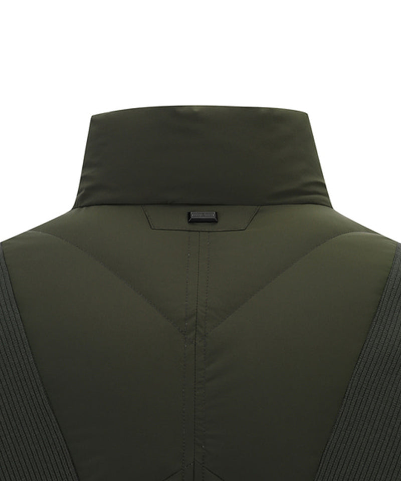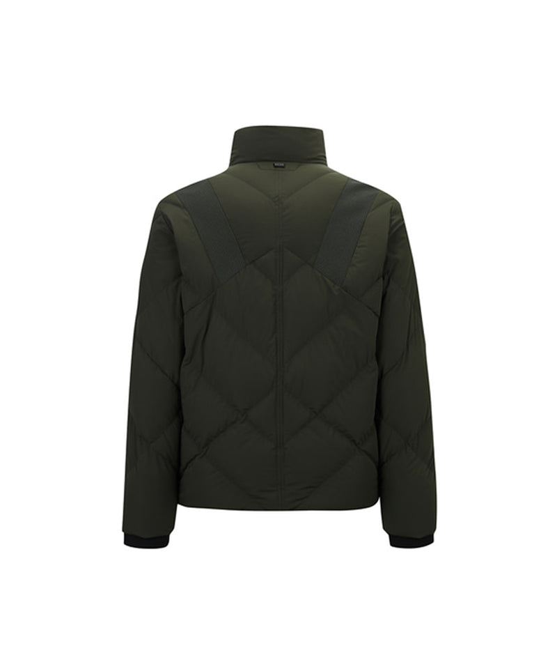 This is a high-neck mid-down jumper made of lightweight and stretchy material. The geometric quilting creates a three-dimensional shape. The wide action band on the back provides smooth swing and mobility. The inner specifications use two types of thermal lining in a mix-and-match manner to further enhance warmth.