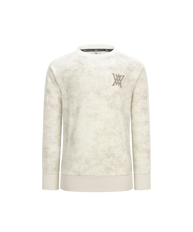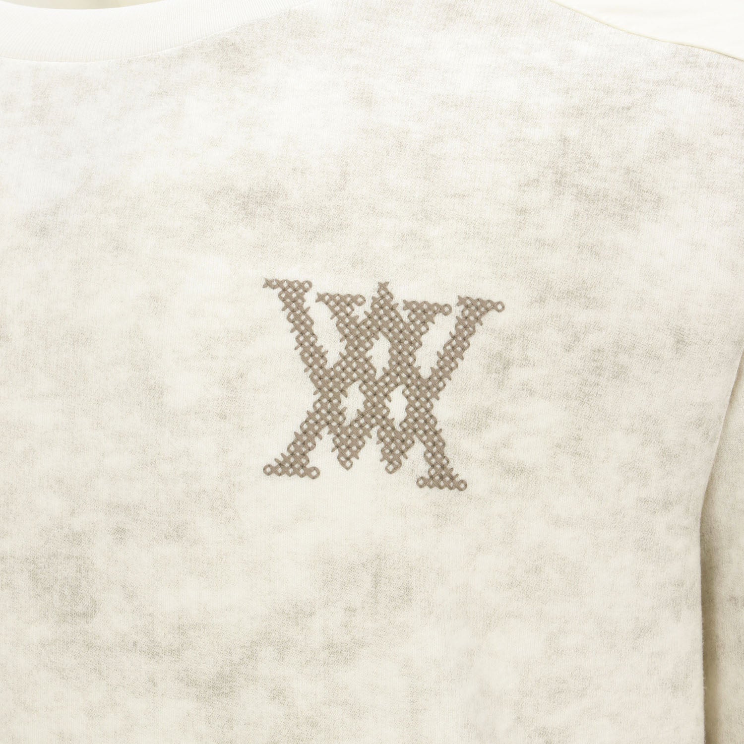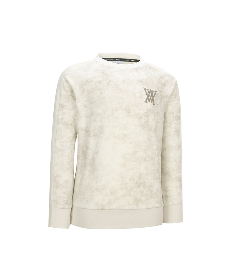 This is a man-to-man T-shirt featuring a natural pattern. The sleeve line is accented with a different fabric and the chest and back are embroidered with a subtle logo. It is comfortable to wear with a loose fit and can be stylishly styled with items such as jogger pants.