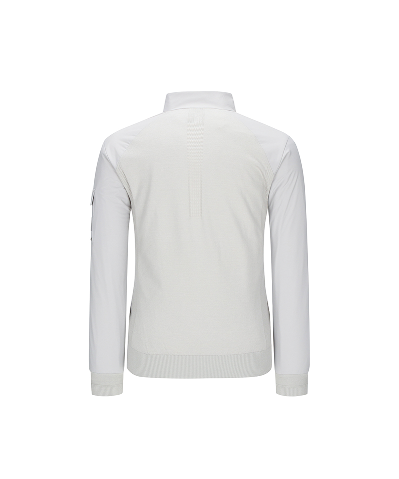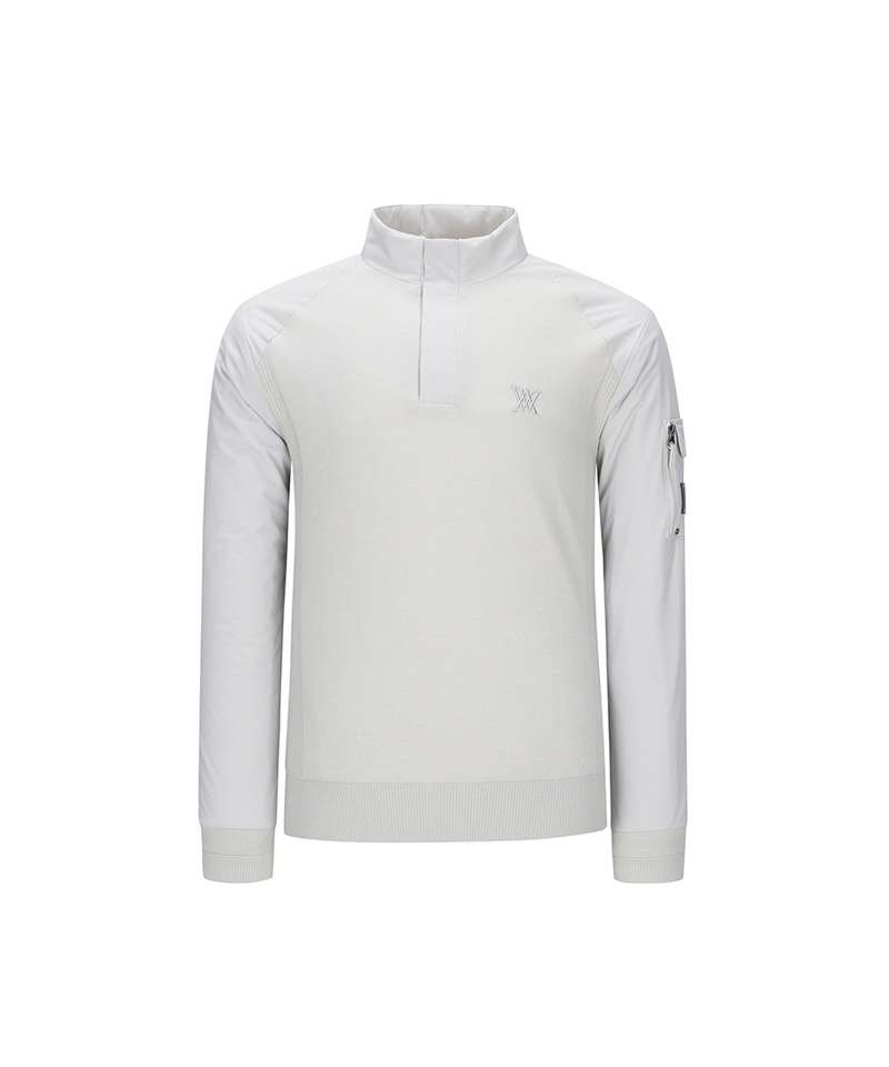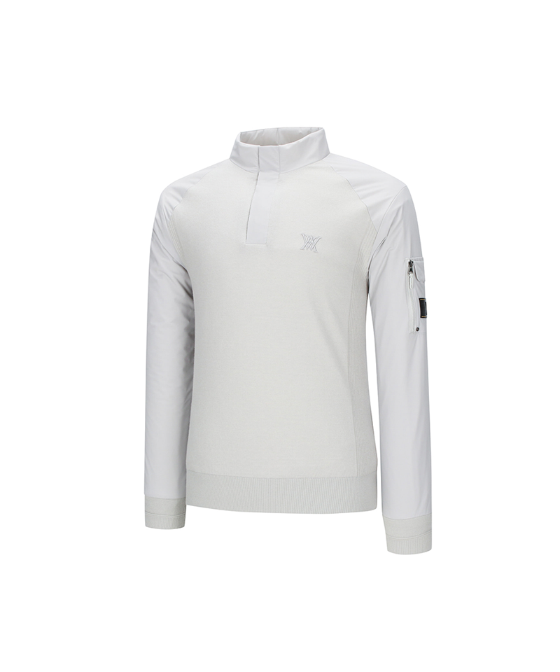 Men's high-neck hybrid performance windproof pullover with a soft knit body and woven sleeves and collar. The sleeves are windproof and the body is lined with thermal lining, making it a very warm item to wear in winter. A pocket on the left sleeve with a logo adds storage and style.