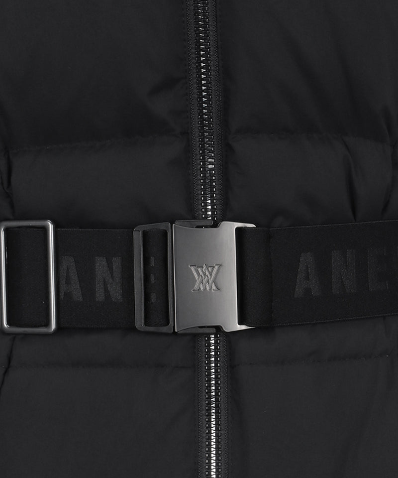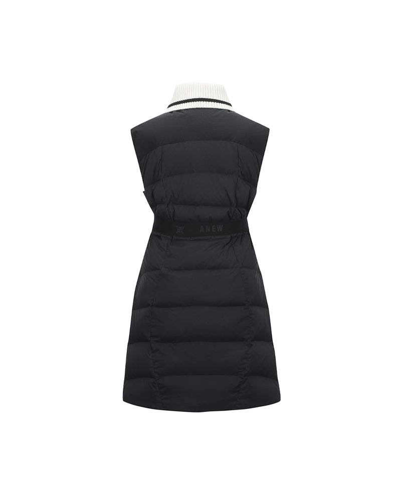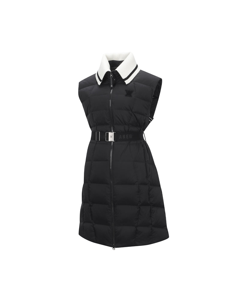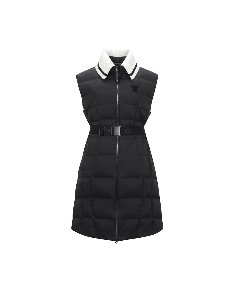 This is a long-length vest with excellent heat retention with goose down filling. The two-way zipper makes it easy to wear even with a long length, and the waist belt can be adjusted in size. The wave-shaped quilting line creates a slimming effect. The neck shirring color scheme increases casualness and heat retention, allowing for a variety of styles in the field and daily life.