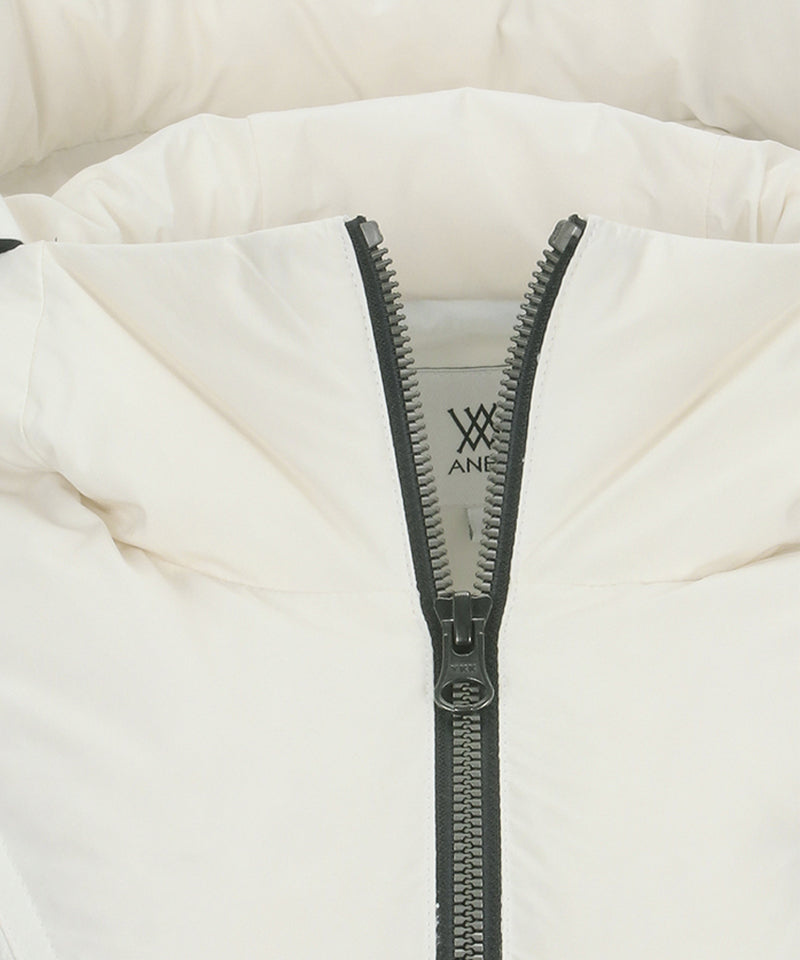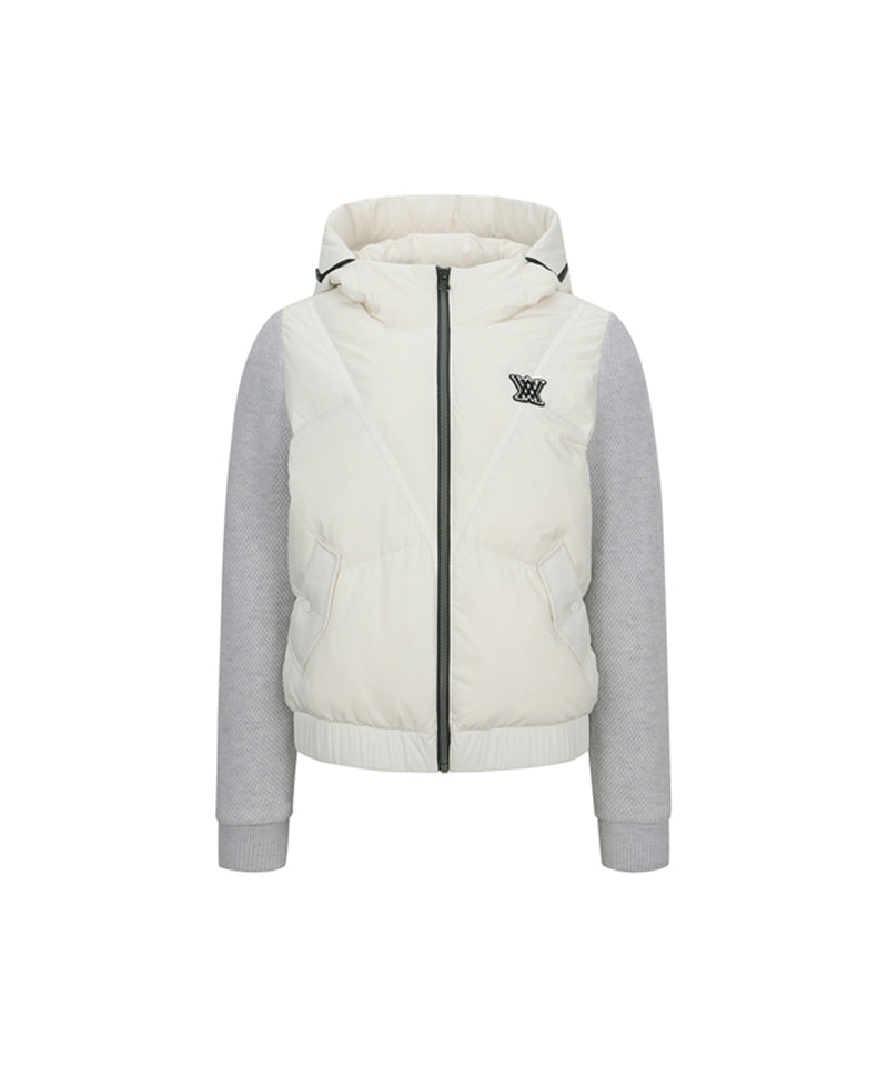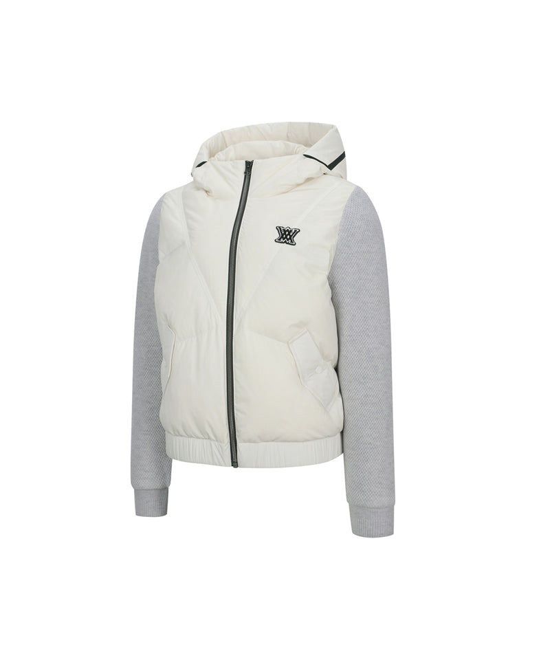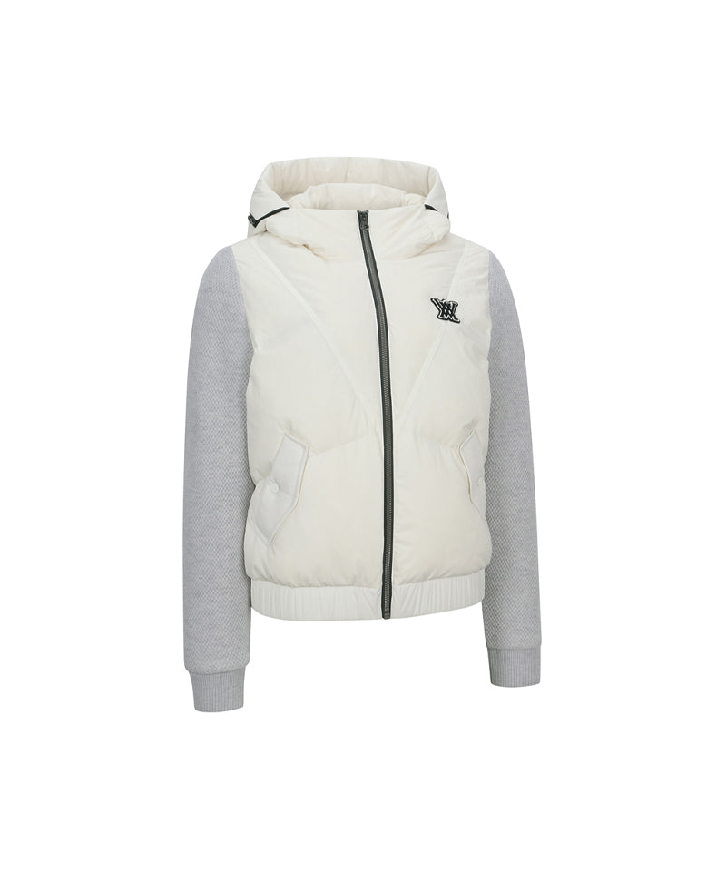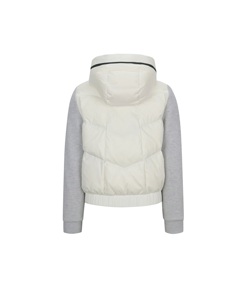 This is a woven mix hybrid zip-up sweater. The body is made of a fabric with excellent stretch, making it comfortable to swing, and the item has improved warmth by using Hungarian goose down and a windproof lining on the front. The sleeves are made of a knit with a soft texture for a more luxurious feel.