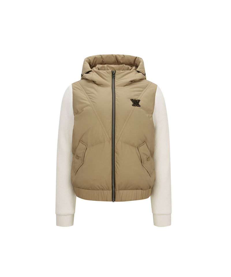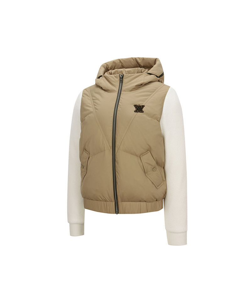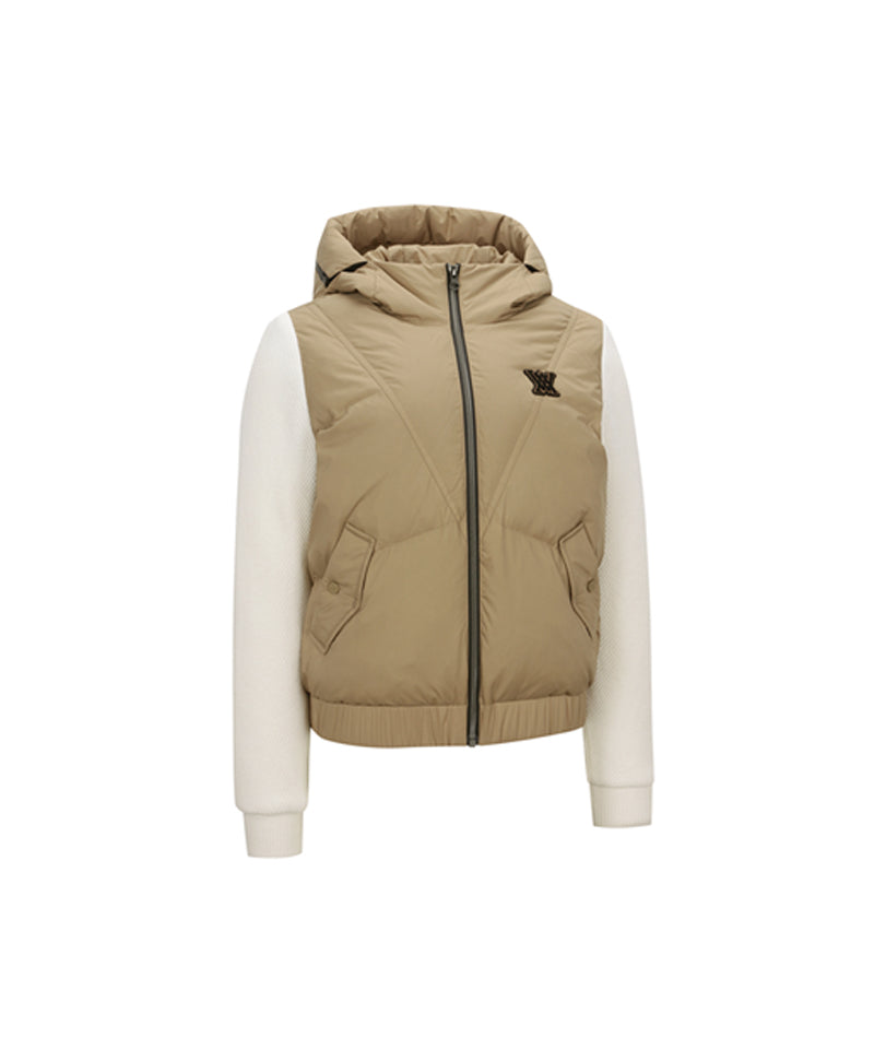 This is a woven mix hybrid zip-up sweater. The body is made of a fabric with excellent stretch, making it comfortable to swing, and the item has improved warmth by using Hungarian goose down and a windproof lining on the front. The sleeves are made of a knit with a soft texture for a more luxurious feel.