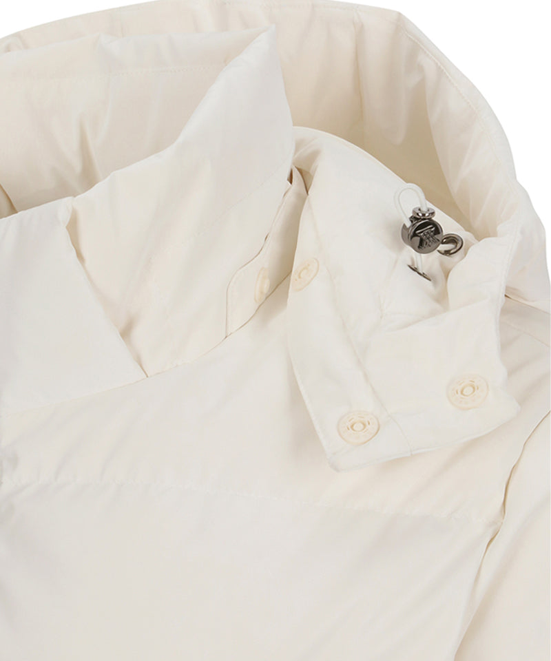 This is a mid-length goose down jumper with a stylish shape. The slim waistline and balloon-shaped hem create a feminine look. The hood string can be tightened to create a more stylish look, and the luxurious lining allows for a variety of looks in the field and in everyday life.