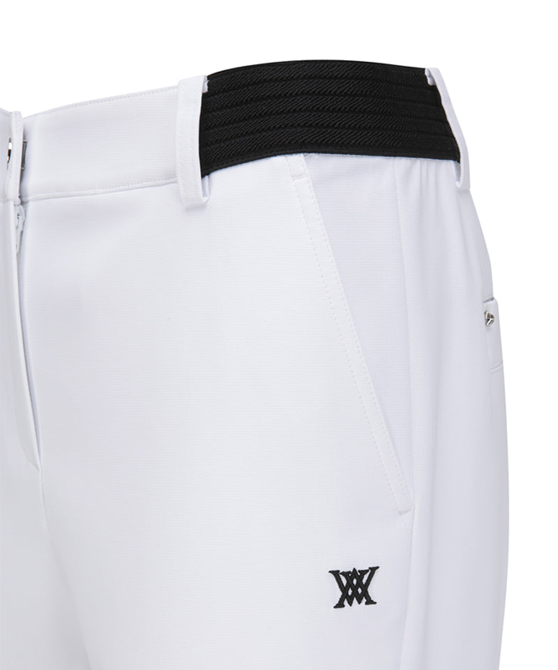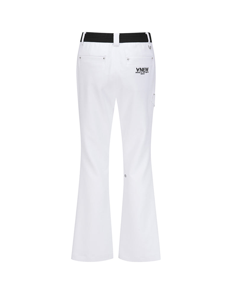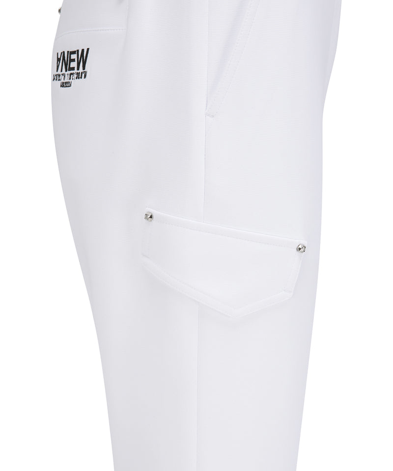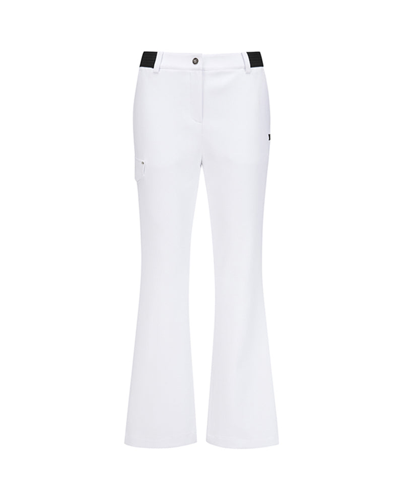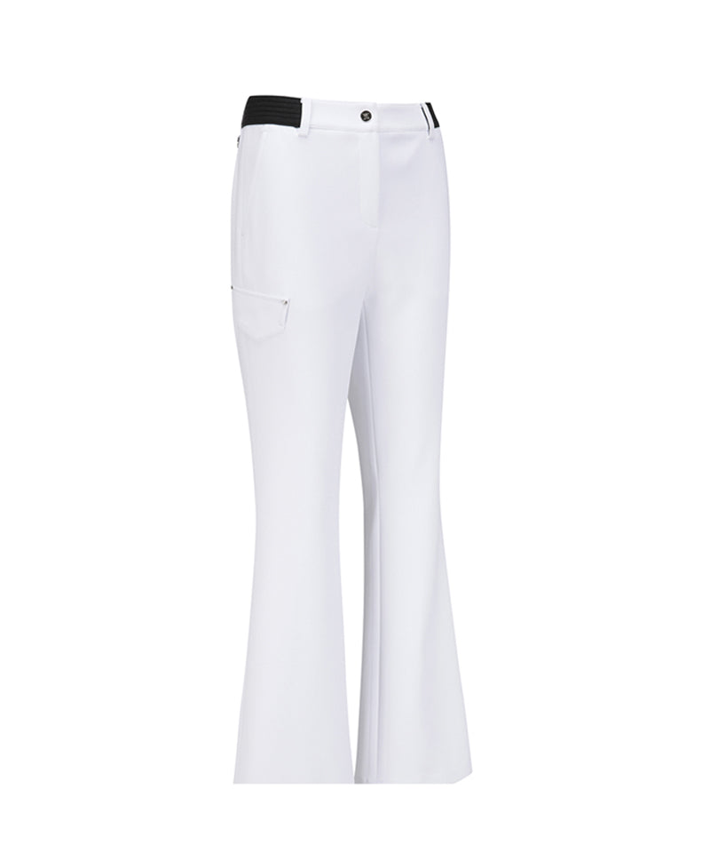 These are bootcut pants made of textured material. They are stretchy and comfortable to wear, and the elastic band holds the waistline, while the widened hemline also has a body-correcting effect, making you look slimmer when worn. The decorative pocket on the right thigh adds a stylish touch as a decorative element when worn. The embroidery on the back right pocket adds a touch of elegance, giving it a new feel.