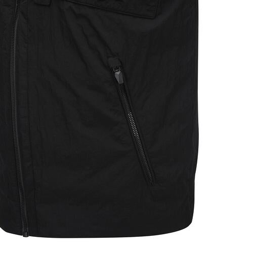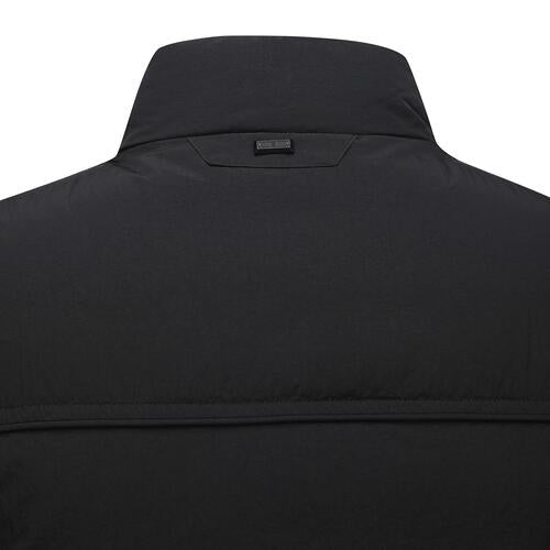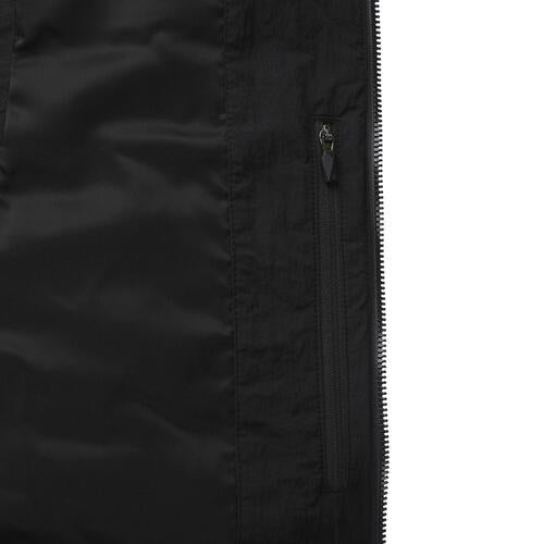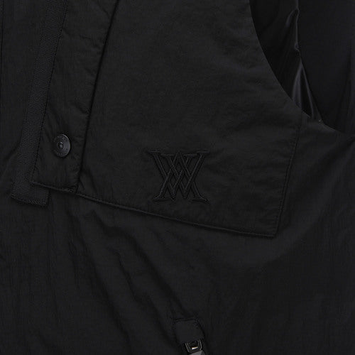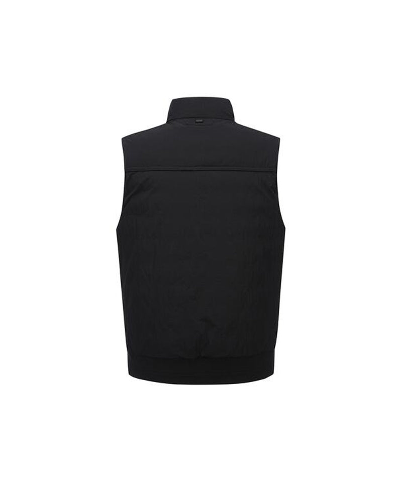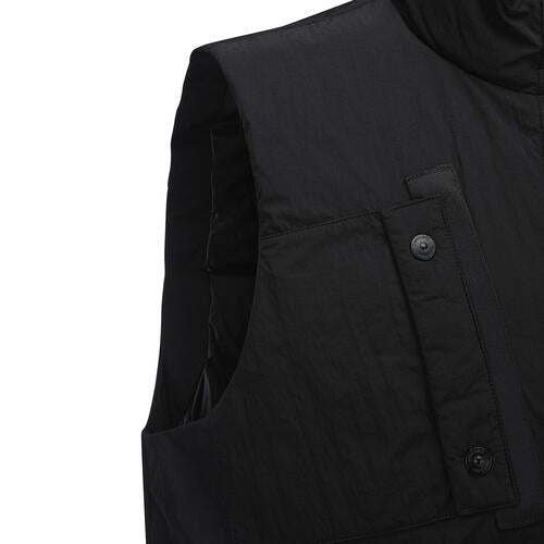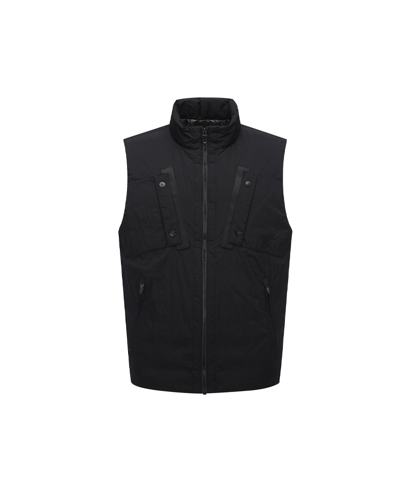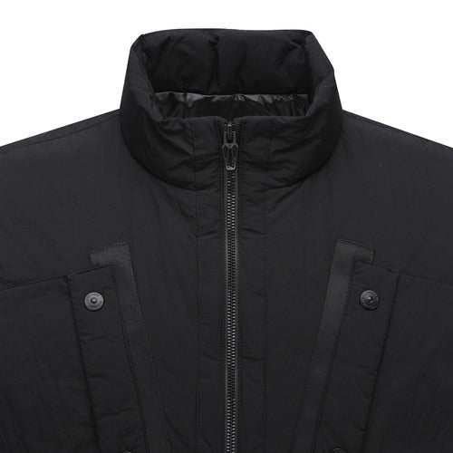 This is a high-neck, medium-lightweight vest with a subtle sheen and military details. It provides high warmth through filling and thermal lining, and various pockets such as the front outer pocket are available for storage. The hem line is fixed using high-density ribbing at the bottom of the back panel. The unique design allows for a stylish look.
