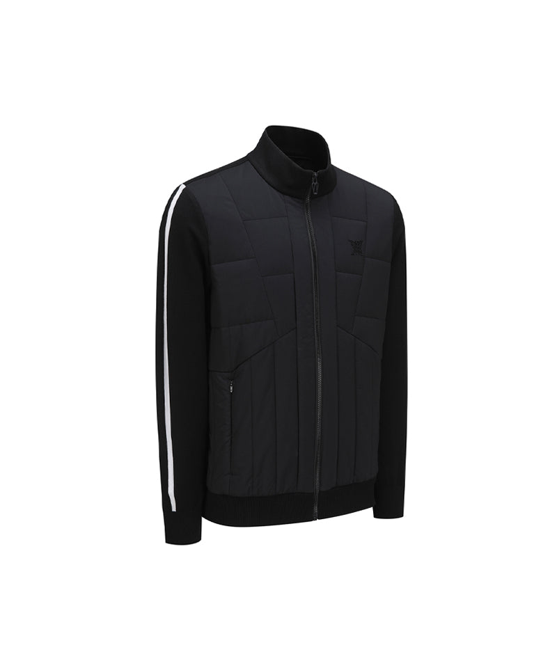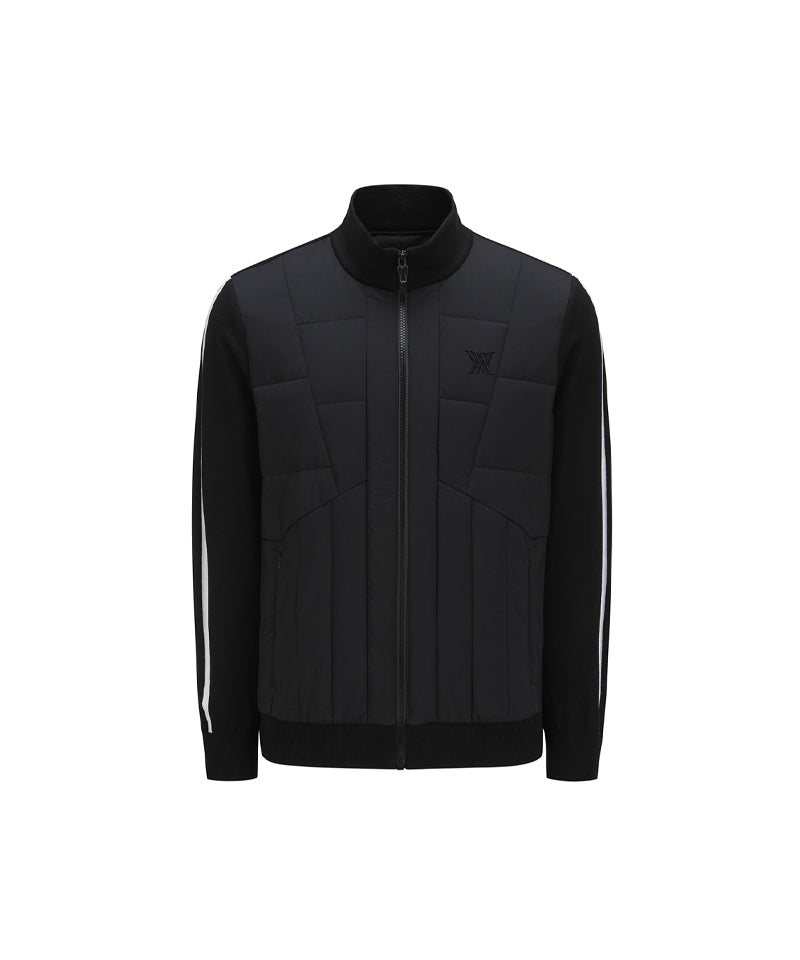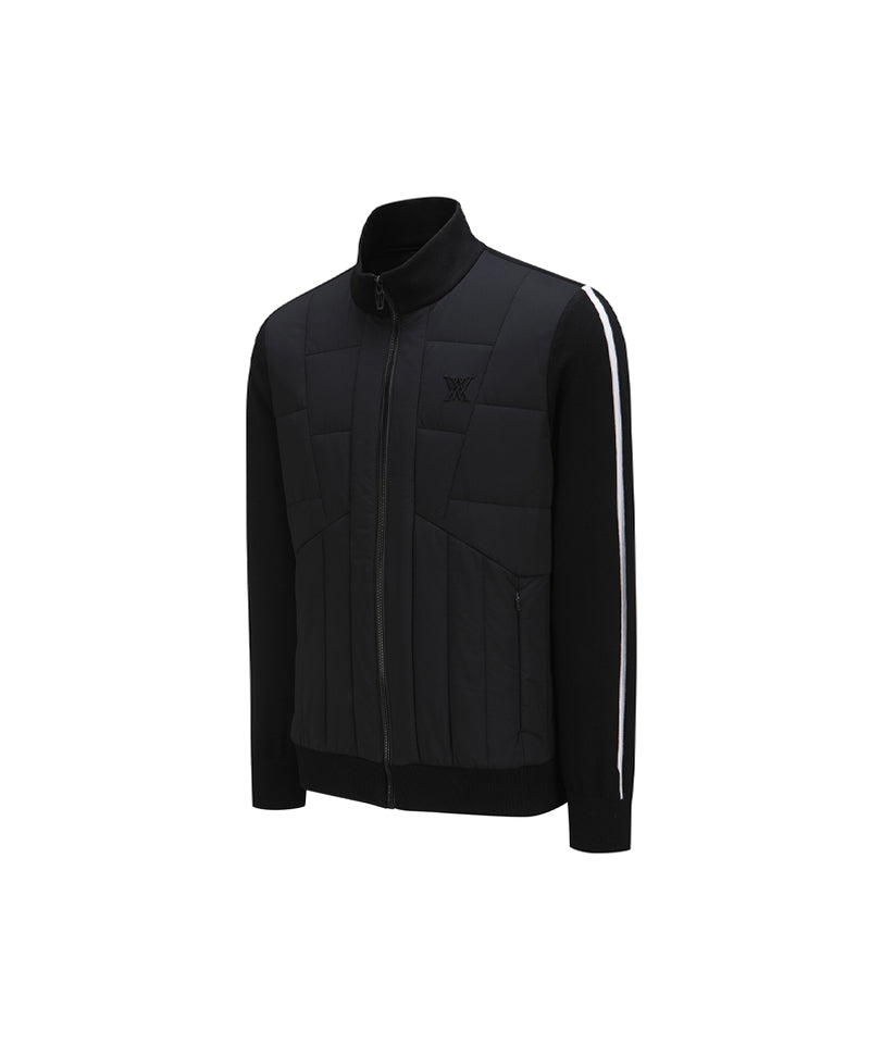 This is a knit hybrid zip-up jumper that can be worn manly as an in-between season essential. It features contrasting tipping on the knit sleeves and is combined with thin padding for lightweight and warmth, making it a great item to wear in all types of weather.