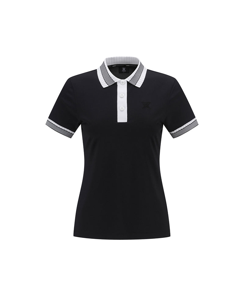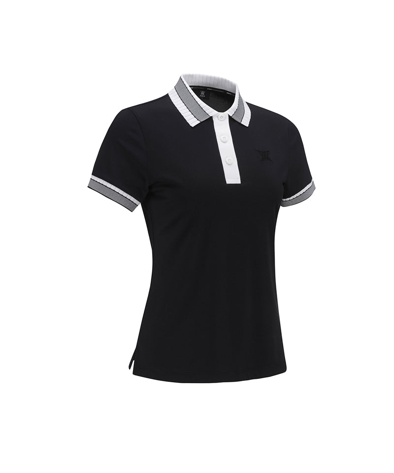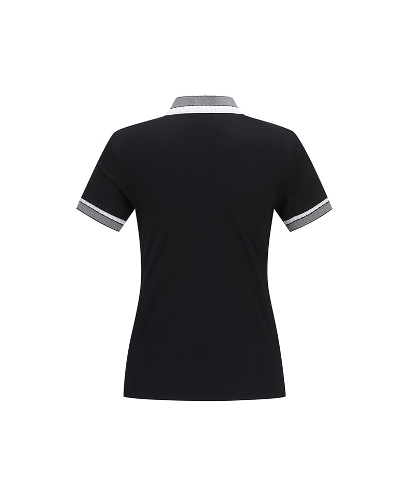 Women Collar Color Block Short T- Shirt - Black