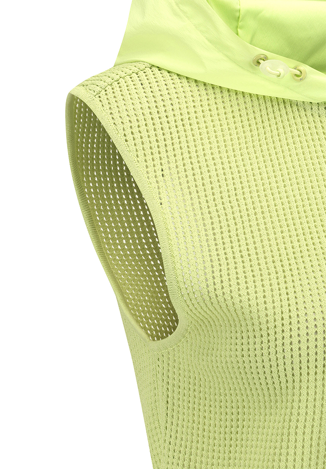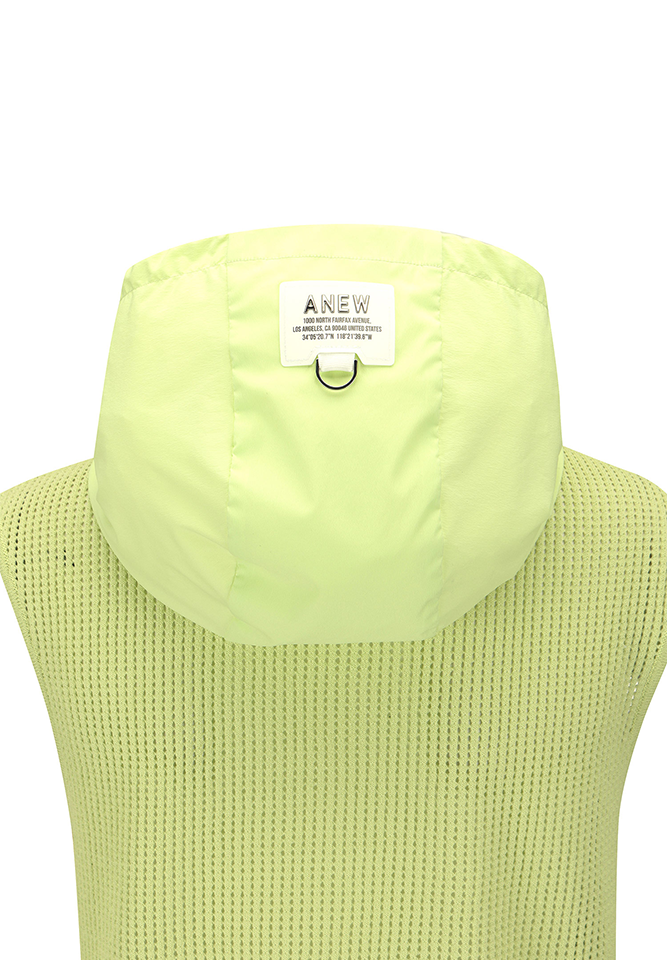A lightweight, breezy mesh texture meets a hooded detail for an elevated, effortlessly trendy vest silhouette. The sleeveless cut and generously relaxed armhole make it an ideal layering piece over any outfit, while the hood and neckline detailing strike the perfect balance between casual ease and current, fashion-forward style.